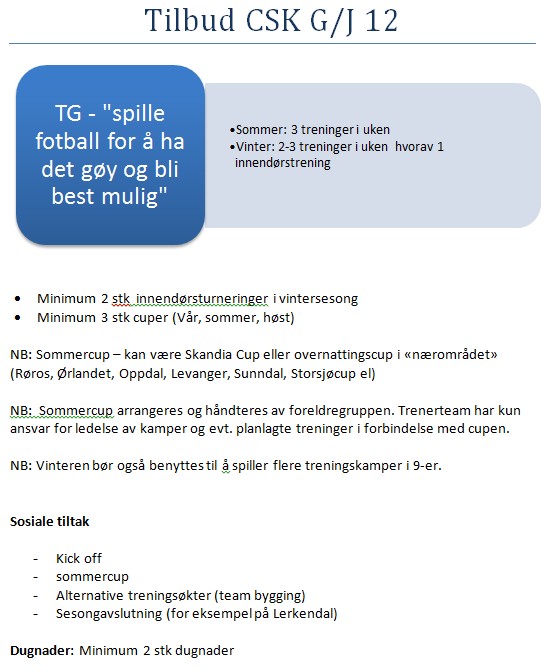 SPU har nå sendt ut sportslig tilbud for alle årstrinnene i CSK. For oss, som neste sesong er J12, så er det sportslige tilbudet som skal legges til grunn som følger: