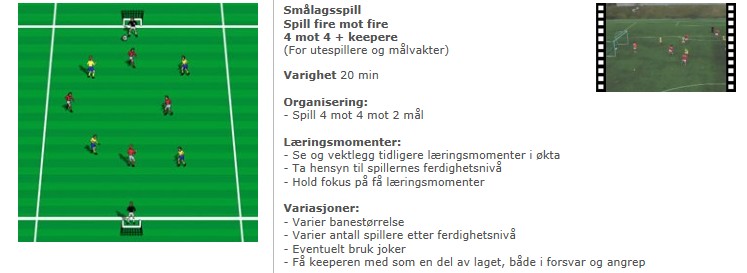 De to første øvelsene som dekker ny temadel er derfor nye. I øvelsen «Oppspill – gjennombrudd» kjører vi i starten kun Handling A med begrenset press fra forsvarer, men vi kan godt forklare handlingsvalget mellom A og B. Vi «åpner» øvelsen til å omfatte valg mellom A og B med fullt forsvarspress på en senere trening.
