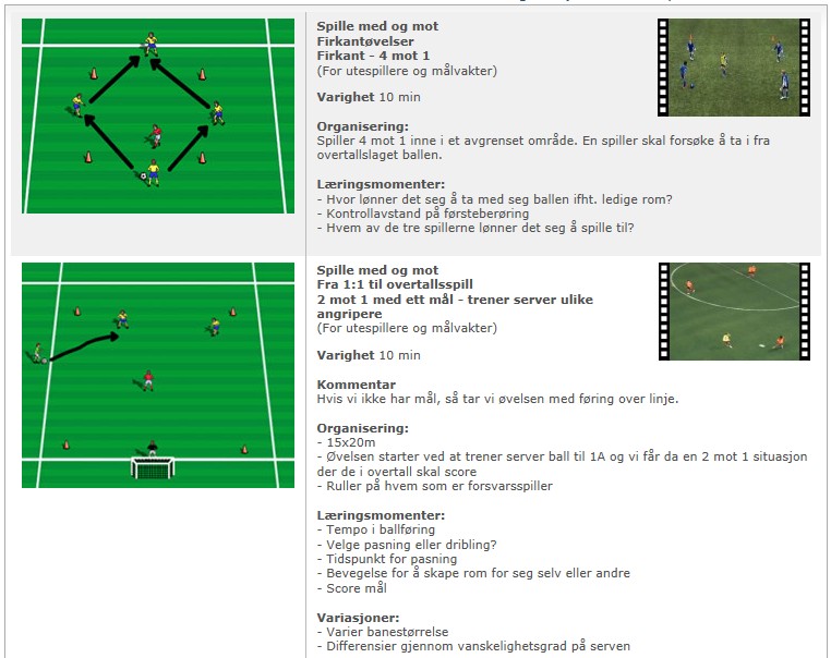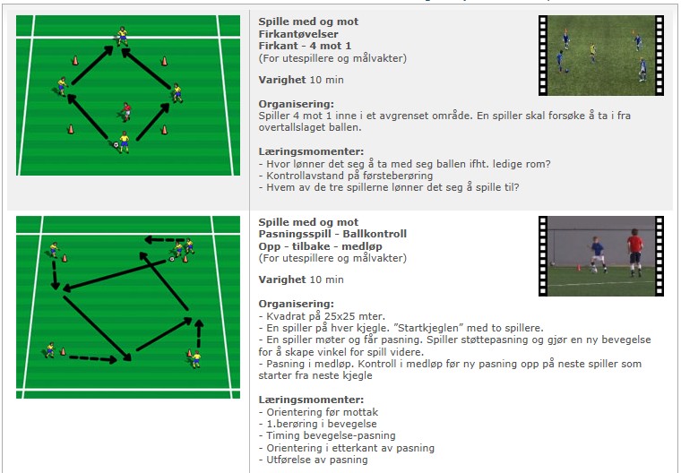 Spilleren skal kunne skape en to mot en-situasjon, og sammen med medspiller gjennomføre et bevegelses- og pasningssamarbeid for å passere motstandere. Læringsmomenter: Skape lokale 2 mot 1 situasjoner. Tempo i ballføring. Velge pasning eller dribling? Veggspill/overlap. |