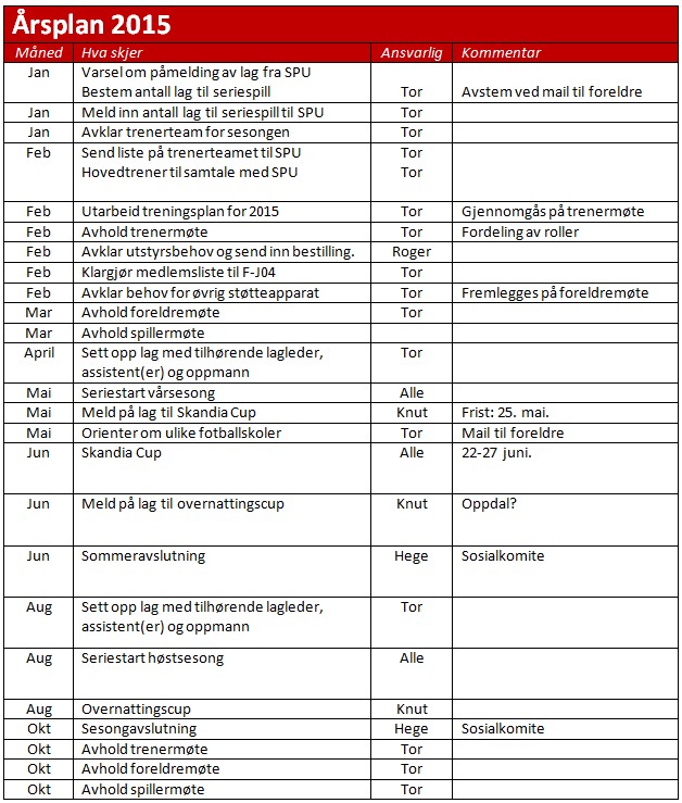 Nedenfor følger en oversikt over årsplan for kommende år.