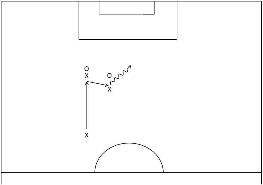 Den ene spissen møter ballføreren. Den andre løper diagonalt inn i rommet denne har forlatt. Det gis dermed to pasningsmuligheter: enten (1) å spille rett på møtende spiss eller (2) å spille i rom foran diagonalløpende mottaker. Å spille på andrebevegelsen er særlig effektivt og kommer oftest overraskende på motstanderen.