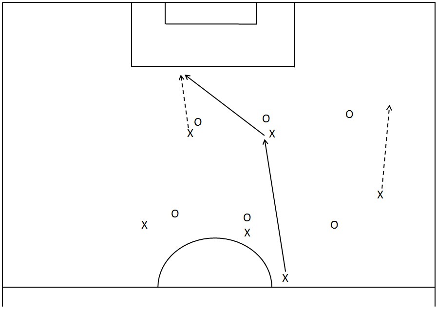 Mottaker av oppspill bruker spiller i støtte, som igjen spiller direkte inn i bakrommet til en gjennomløpende medspiller eller til flankespiller som overlapper.