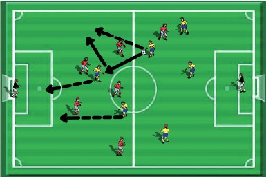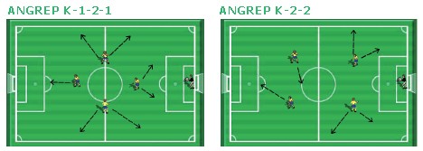 Figur 2: Her vi ser vi to lag i to forskjellige formasjoner som skaper plass ved å bevege seg i bredde- og lengderetningen for at keeper skal få flere pasningsalternativer. Og så lager vi det vanskelig for motstanderlaget.