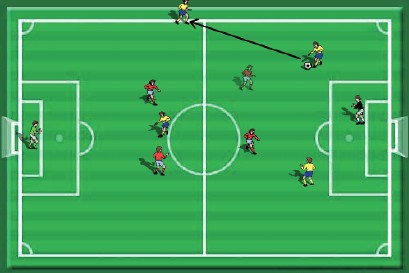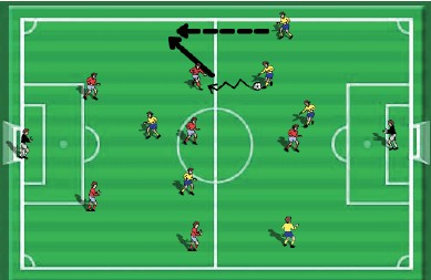 Figur 4: Ballfører ser at det er plass på yttersiden. Legg merke til posisjon til ny ballfører. Han eller hun ser både medspiller med ball og motstanders mål