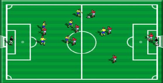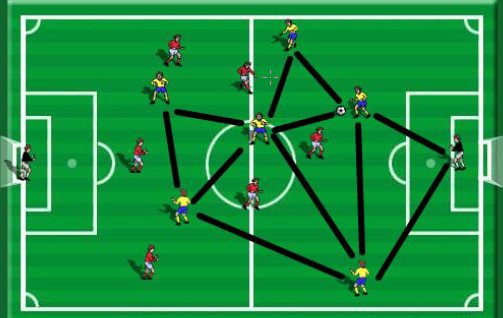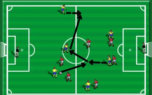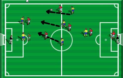 Fig nr. 11 Her passerer det gule laget det midtre leddet til det røde laget med et veggspill sentralt i banen.