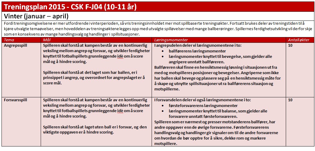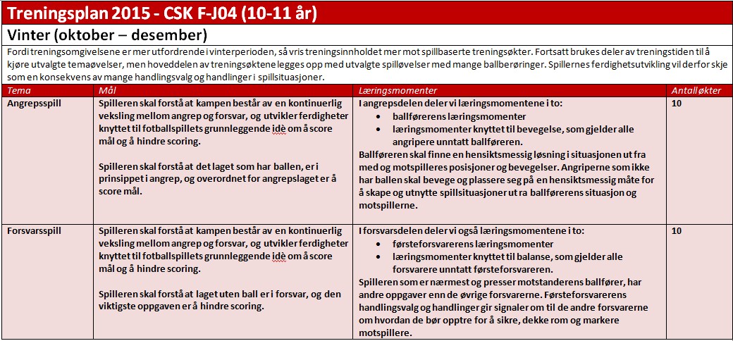 Treningsplanen for CSK F-J04 for 2015 er inndelt i fotballens «naturlige årsperioder» og er illustrert til slutt på denne siden.