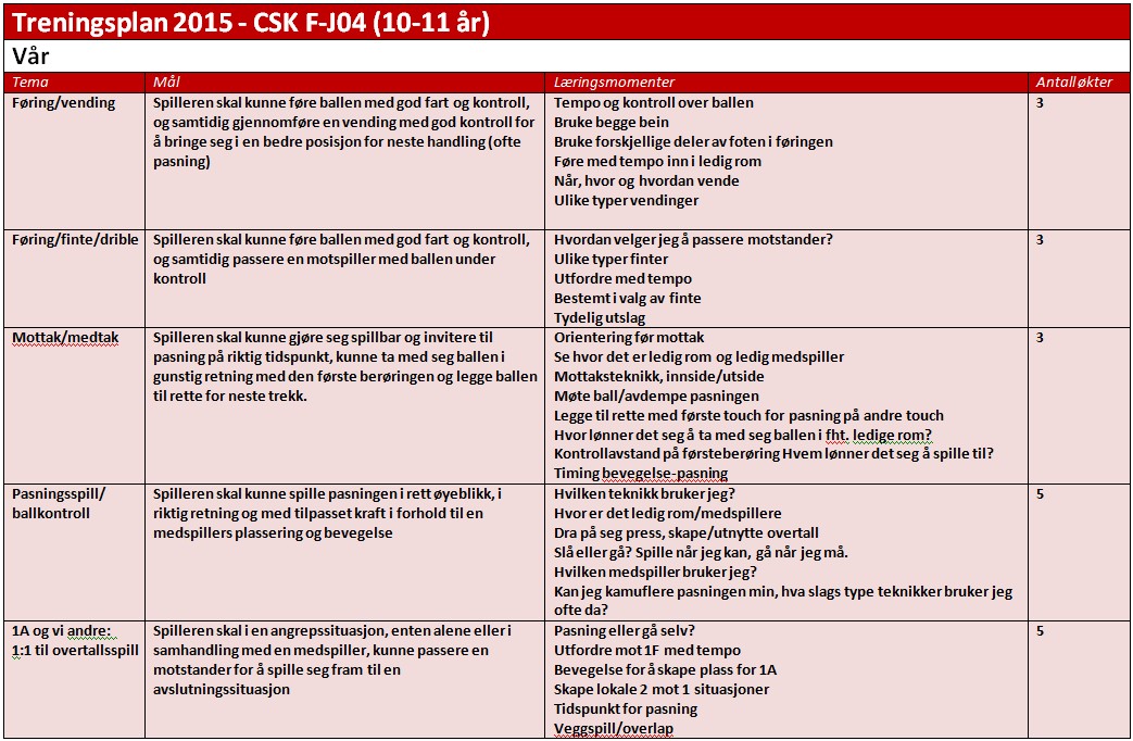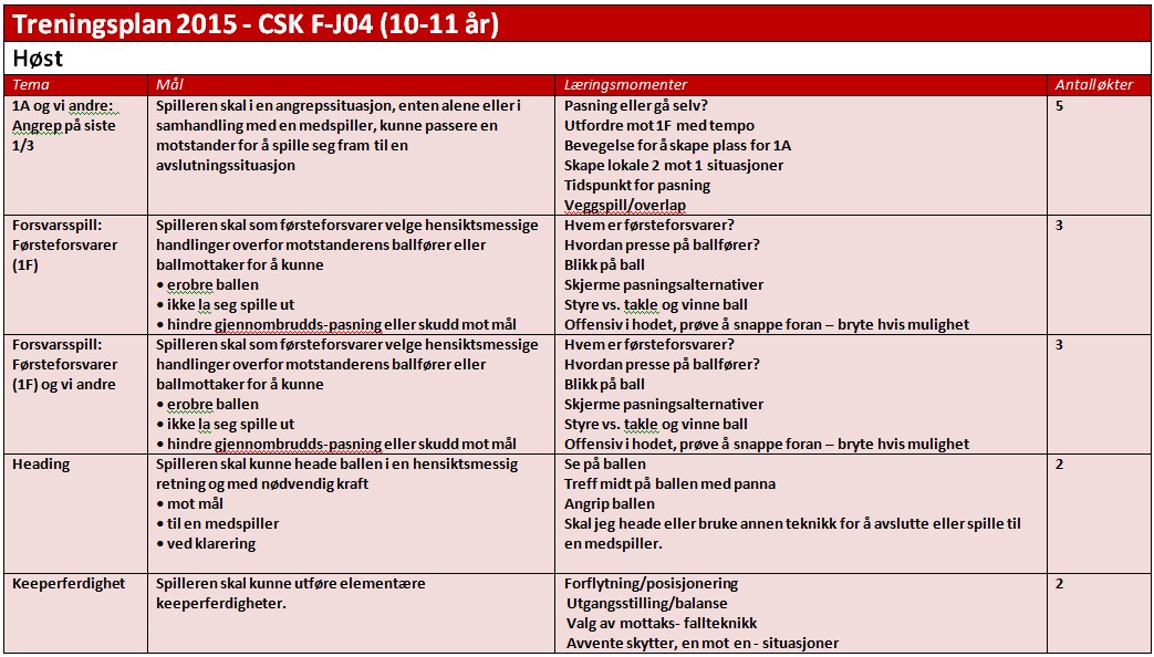 Basis for treningsplanen er NFFs utviklingsplan for alderstrinnet 10-11 år (ligger på treningsøkta.no), som er tilpasset spillerantall og tildelt treningstid fra CSK.